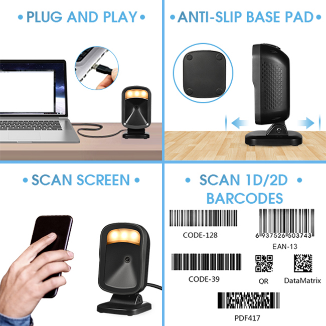 2.【1D 2D Desktop Scanner】It is easily to capture most 1D, 2D barcode on labels, paper, and mobile phone or computer screen. also it can scan special barcodes, including blurring barcode, damaged barcode